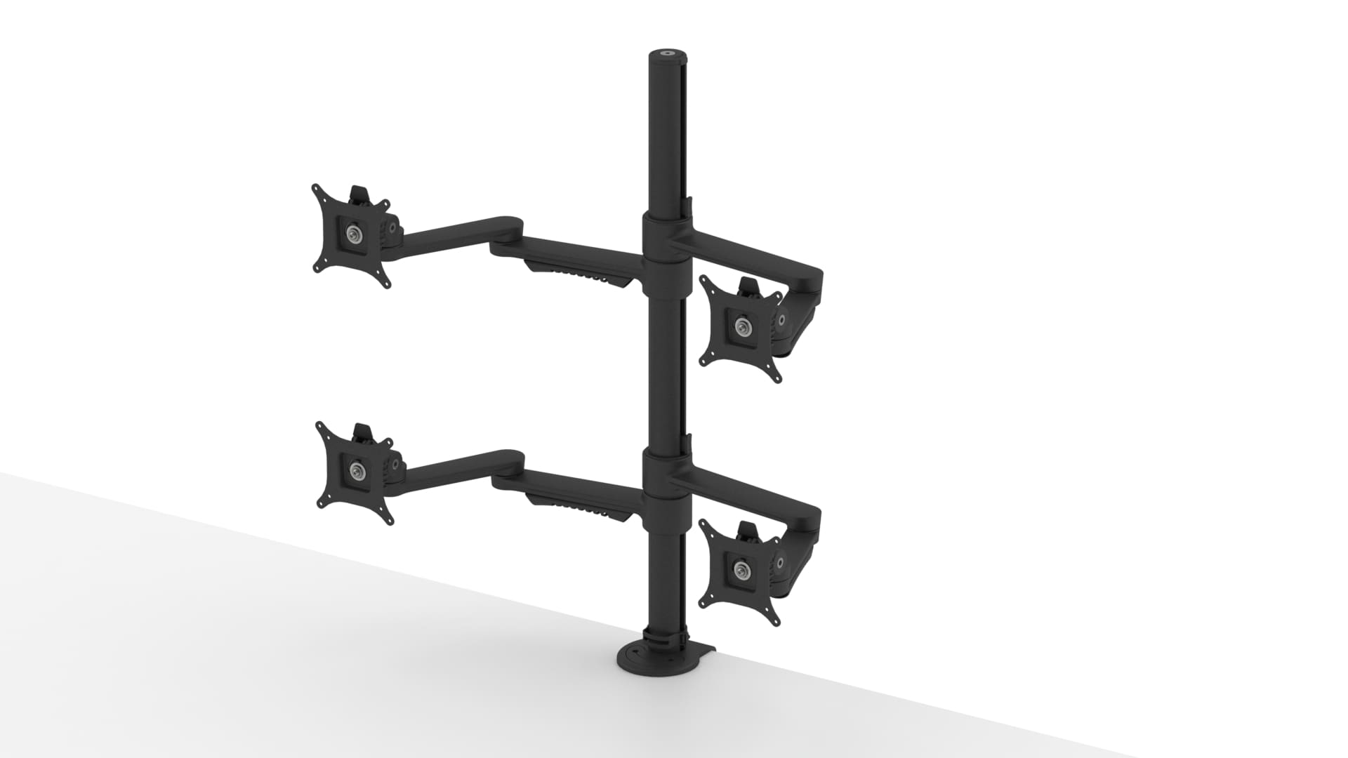 Mount your four monitor flat screens or combination of monitors with laptop stands, of up to 8kg each on an articulated mount with easy height, tilt and angle adjustment to achieve the ideal ergonomic viewing angle.