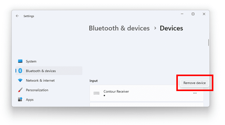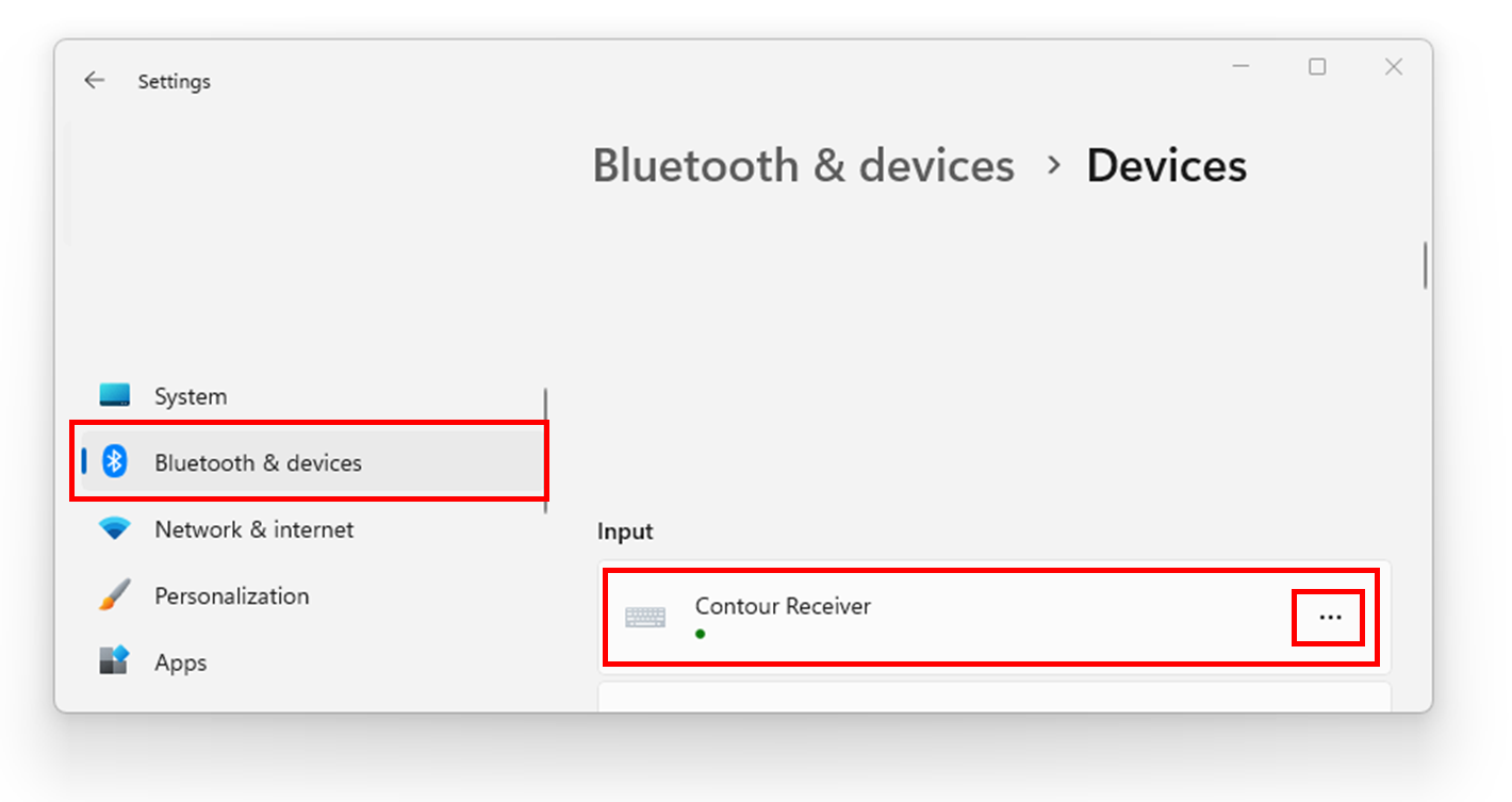 Under the Bluetooth & devices > Devices window, select the three dot menu icon next to the Balance Keyboard in the Input list. It will be listed as Contour Receiver.