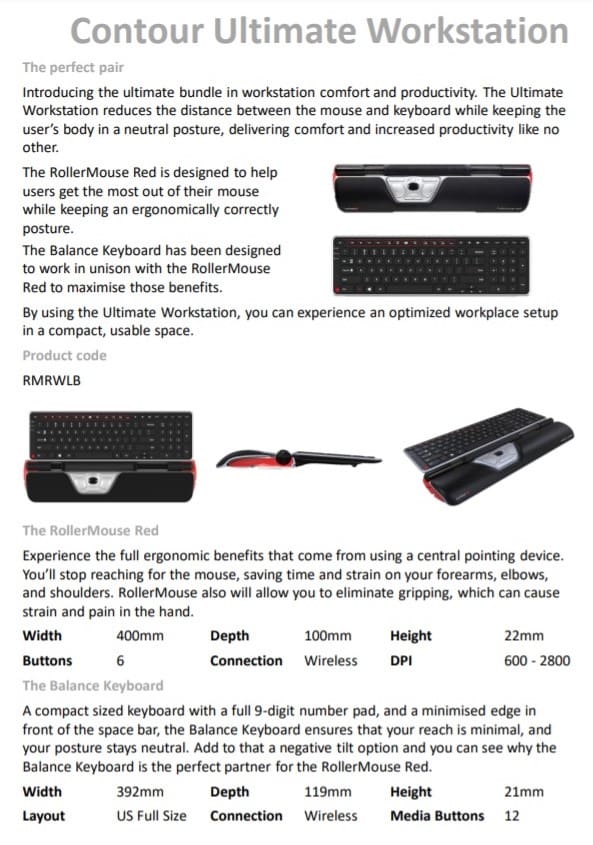 Bundle includes the advanced Contour RollerMouse Re:d Wireless teamed with the Contour Balance Wireless Keyboard.