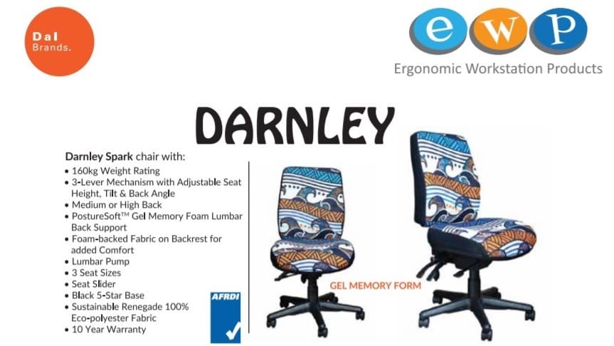 The Darnley Spark features a Medium or High PostureSoftâ„¢ Gel Memory Foam Lumbar Back Support, Foam-backed Fabric on Backrest for added comfort, Lumbar Support, Premium stitching details; three Seat Sizes, Seat Slider, 3-Lever Mechanism, 160kg Weight Capacity, and a 10 Year Warranty.