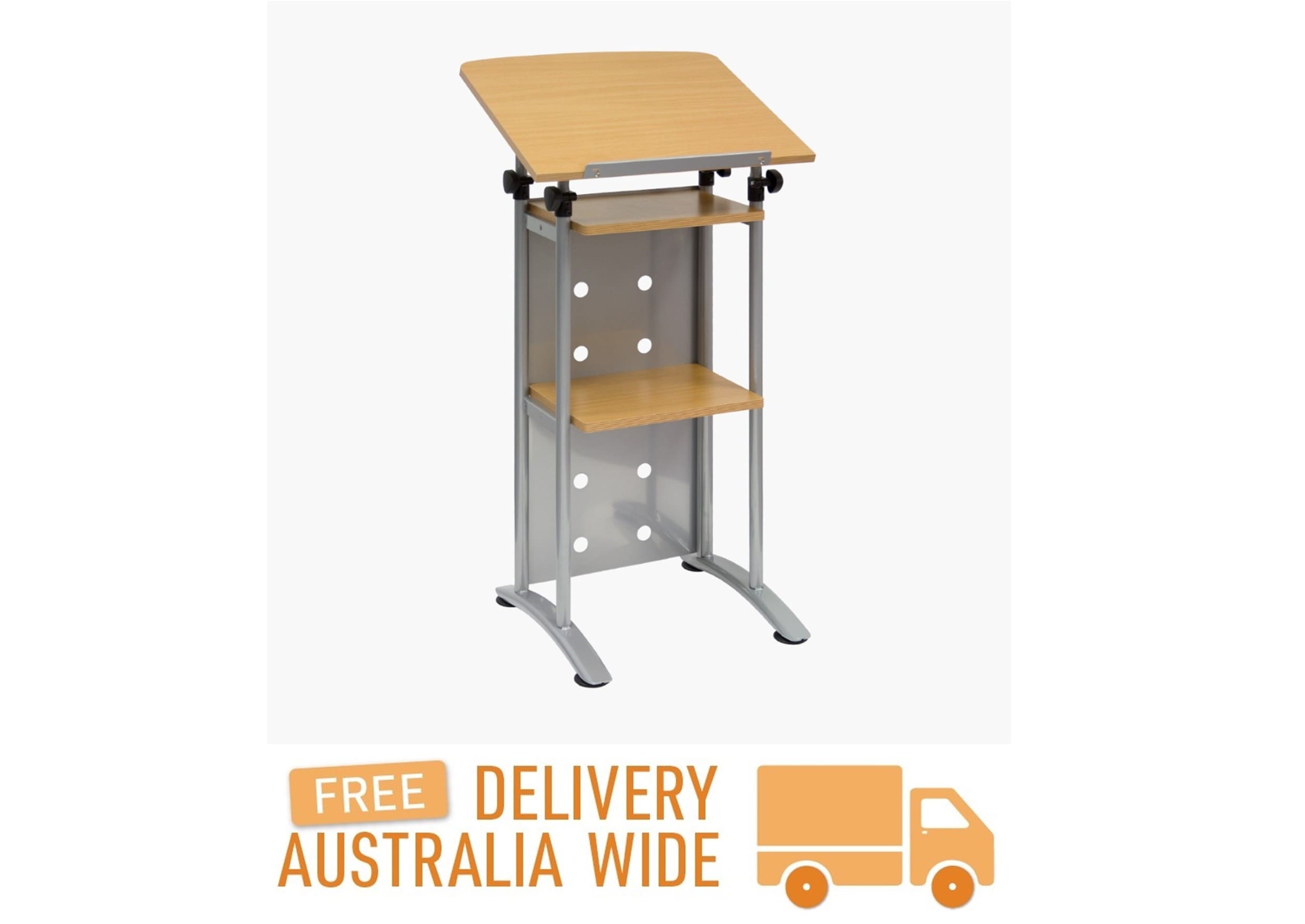 The Deluxe Lectern is perfect for presentations.  It features a beech height and tilt adjustable top, two shelves and a powercoated steel fascia.