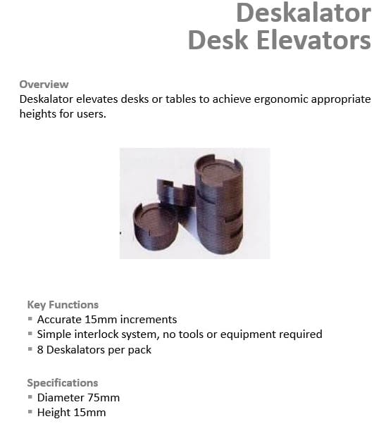 The Deskalator is used to elevate desks or tables to achieve a height better suited to a person's ergonomic requirements.  Each Deskalator increases the height of a desk by 15mm.  Each pack includes 8 Deskalators.