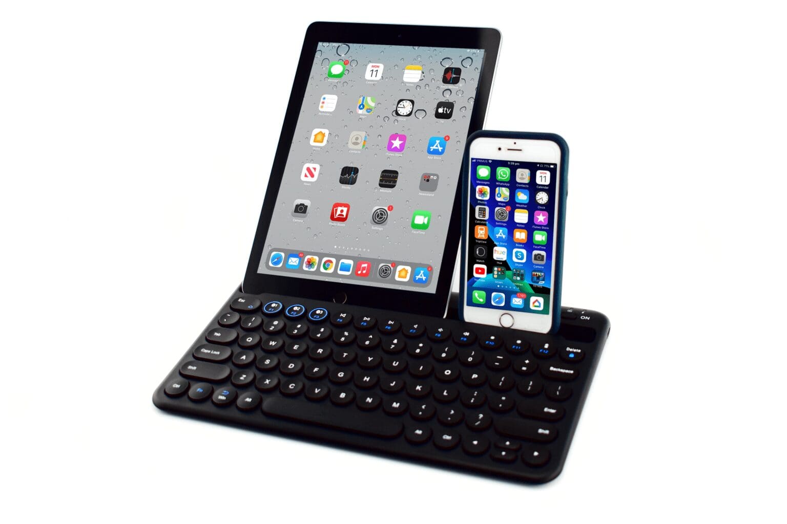 A compact, rechargeable, Bluetooth keyboard that can connect to multiple devices.