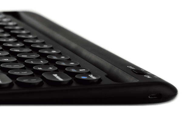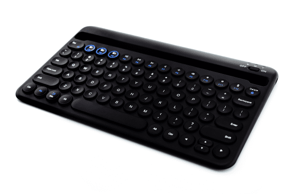 A compact, rechargeable, Bluetooth keyboard that can connect to multiple devices.