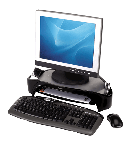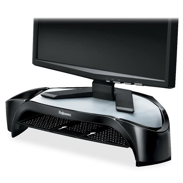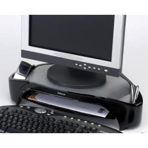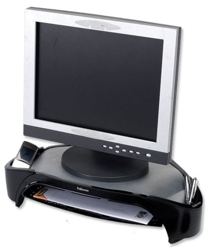 The Fellowes Smart Suites Monitor Riser Plus raises your screen to eye level to prevent neck strain.