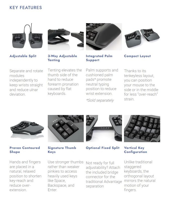 The Advantage360 is a fully split contoured keyboard designed to provide maximum comfort and adjustability. Split, splay and tent each module for the optimal typing posture. Equipped with tactile Brown mechanical keyswitches and the SmartSet Programming Engine.