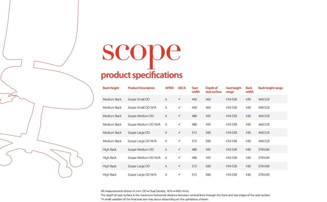 The Scope Range have achieved Certification with AFRDI 6 (meeting Australian Standards and Certified for severe commercial use) and GECA (Good Environmental Choice Australia).  The moulded Polypropylene back has achieved certification with the Good Environmental Choice Label which recognizes products that meet standards of environmental, quality and social performance.