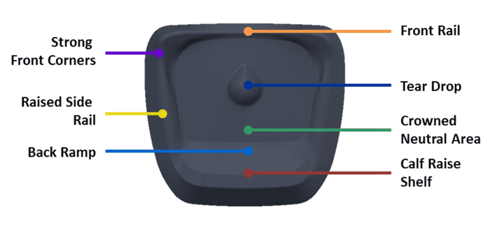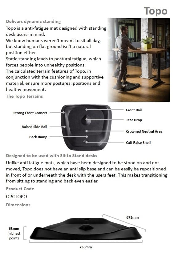The Topo design has seven calculated terrain features that optimally support the body while standing and stimulate healthy movement.  The terrain has been specially designed to engage the blood pumping mechanism of the calves.  Moving around on these terrains in a combination of stances, articulates joints and activates muscles.  These movements energise, improve circulation and make standing healthier.