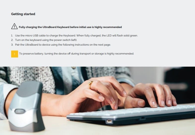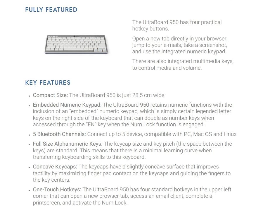 The UltraBoard 950 Bluetooth Compact Keyboard is designed to enhance ergonomics and reduce strain during computer use.