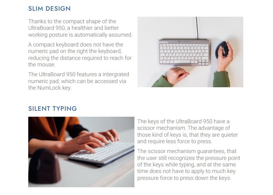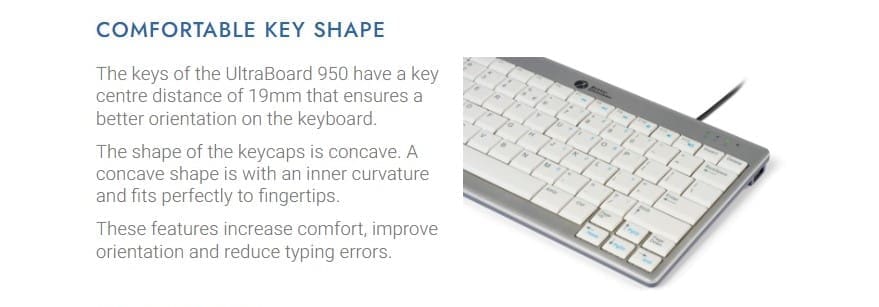 The UltraBoard 950 Wired Compact Keyboard is designed to enhance ergonomics and reduce strain during computer use.